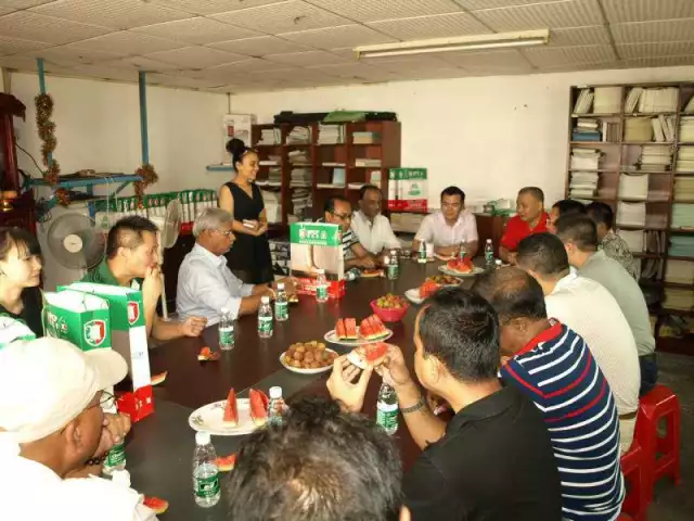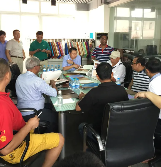 东莞鞋业商会会长何家明与孟加拉采购团成员商讨问题